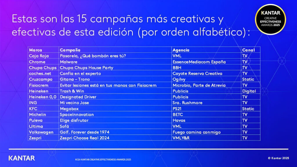 Las 15 campañas que componen el ranking de Kantar de la última edición de sus Creative Effectiveness Awards España son piezas reconocidas por su capacidad de impacto y memorabilidad, y pertenecen a las siguientes marcas líderes en sus respectivos sectores: Caja Roja, Chrome, Chupa Chups, Coches.net, Cruzcampo, Fisiocrem, Heineken, Heineken 0,0, ING, KFC, Michelin, Puleva, Ultima, Volkswagen y Zespri.