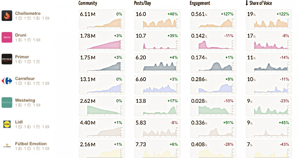 Este análisis del entorno online ha revelado que la frecuencia media de publicación se ha visto incrementada un 15%. Pese a que existen marcas como MediaMarkt o Lidl que han publicado menos durante estos días, otras como PcComponentes y Chollometro han incrementado un 68% y un 46% respectivamente el número de veces que han compartido contenido en este periodo de tiempo.