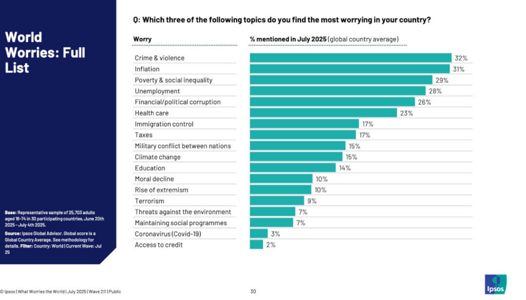 La pobreza y la desigualdad social también figuran como una inquietud importante, señalada por el 29% de los encuestados a nivel global. En este punto, Latinoamérica vuelve a tener una presencia notoria entre los 15 países con mayor preocupación. Argentina se ubica como el país de la región donde más preocupa este tema, con un aumento de 7 puntos en el último año, solo superado por Indonesia. Brasil y Colombia se ubican en la quinta y sexta posición, respectivamente.